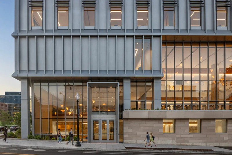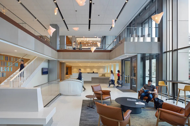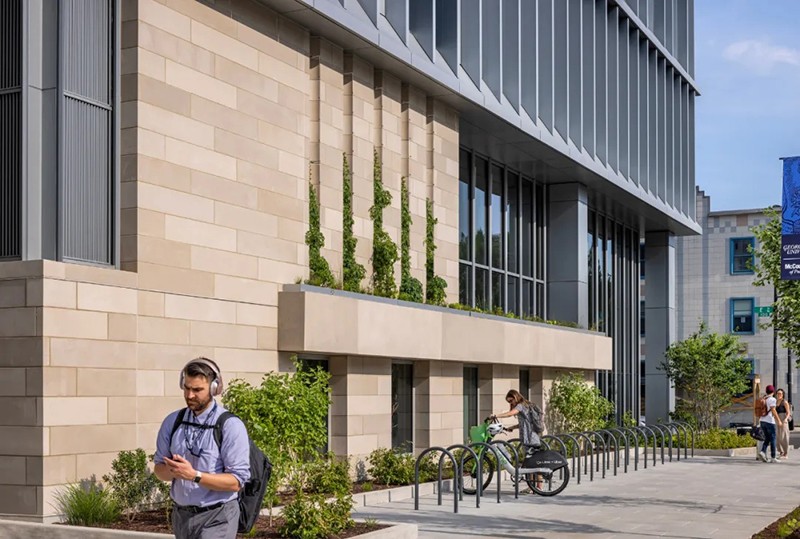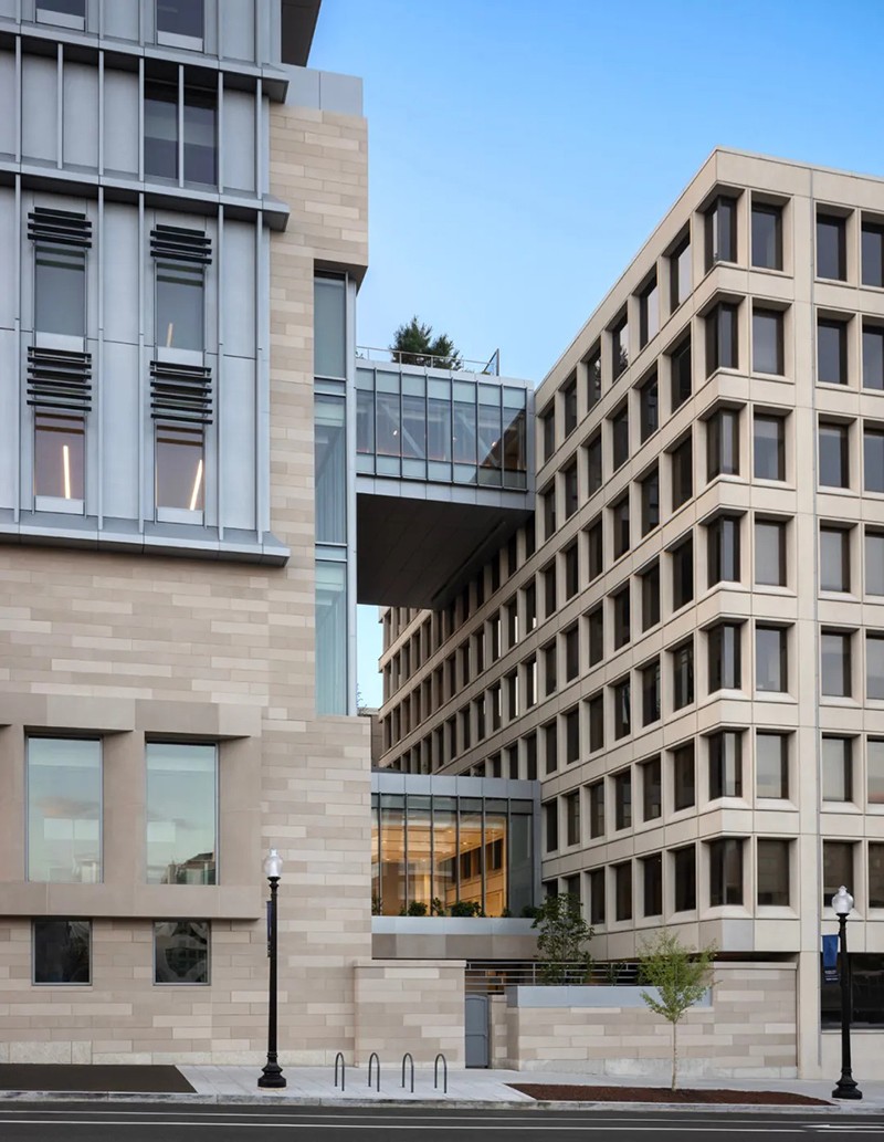 羅伯特-A-M-斯特恩建筑設計事務所(RAMSA)為位于華盛頓市中心喬治敦大學國會大廈校區的麥考特公共政策學院設計了一座新的旗艦建筑。這座新建筑占地 150,000 平方英尺,位于西北部 125 E 街,是學生、教師、研究人員以及活躍在美國首都的廣大決策社區的學術中心。大樓內有大量的教育和社區空間,包括 20 間教室、一個寬敞的主公共空間、學術辦公室、一個可容納 400 人的禮堂,以及一個可俯瞰美國國會大廈全景的大型屋頂露臺和一個可容納 280 人的會場。作為一個致力于應對復雜的國家和國際挑戰的學術中心,麥考特公共政策學院將可持續發展和能源效率放在首位,其設計目標是獲得 LEED 白金級認證。此外,由建筑師、設計師、藝術家和雕塑家瑪雅-林(Maya Lin)設計的一系列針對特定場所的原創裝置,鼓勵建筑使用者考慮周圍的自然環境。作為國會大廈校區的旗艦建筑,麥考特學校是喬治城市中心文脈和連貫性的延伸。125 E St.是一座由石材、鑲板金屬和玻璃幕墻組成的立方體建筑,其外形和規模與周邊建筑一脈相承。垂直鰭片和磚砌底板--主要用于遮擋陽光并優化熱性能--用凸出的線條勾勒出建筑的立面,與鄰近的西北第一街 500 號的統一沖孔窗戶遙相呼應。然而,麥考特學院的 125 E St. 建筑則通過金屬、石材和玻璃的交錯使用,引入了新的視覺趣味。麥考特公共政策學院的內部建筑是由其獨特的地理位置所提供的教育機會所決定的,即靠近美國國會大廈和最高法院等國家主要決策機構??扇菁{ 400 人的禮堂具有廣播功能,屋頂場地可容納 280 人,可接待主要的政策制定者和從業人員,進行與國家和國際政策制定相關的重要討論。大樓的設計提倡有機互動和偶遇,以促進形成一個強大、互聯和包容的學術社區。瑪雅-林工作室(Maya Lin Studio)的一系列裝置作品名為 “映射我們在世界上的位置”(Mapping Our Place in the World),為室內空間增添了活力,使居住者置身其中,促使他們思考自己與更廣闊世界的聯系?!安ㄍ旭R克河沿岸 "是一個安裝在天花板上的玻璃大理石作品,仿佛鳥瞰波托馬克河流域。在主公共區,一系列名為 “是否有鳥 ”的天氣響應吊燈會根據陽光、云朵、雪或雨的存在而改變顏色。當地水道、濕地、森林和草地在一天和一年中不同時間的錄音,通過主樓梯上方的定向揚聲器播放。林還參與了建筑屋頂景觀的設計?!翱罩谢▓@ "是一個帶有橢圓形水池和本地植物的室外露臺。它為人們提供了安靜交談和休憩的機會,同時還弘揚了地區生態,并將美國國會大廈的美景盡收眼底。