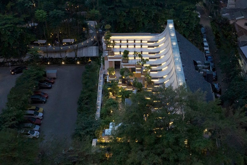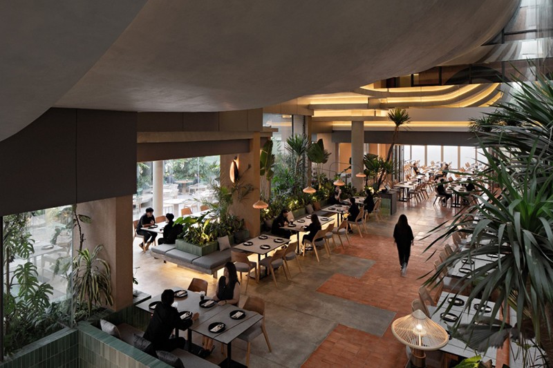 Aruma Split Garden是一個獨特的餐廳項目,占地 2500㎡。其屋頂最為特別,采用了階梯式設計,結合了屋頂、立面、墻壁、對角懸臂結構和家具等多種元素。