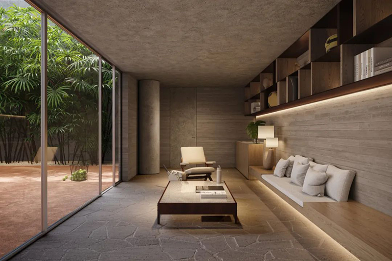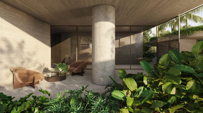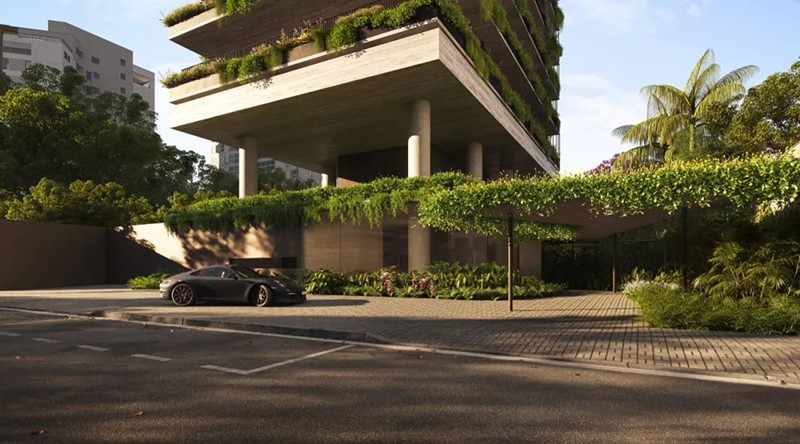 圣保羅的弗蘭卡 1055 號建筑,就是這樣的傾聽者。它位于弗蘭卡街與奧古斯塔大道的街角,身處城市最綠意盎然的社區之一。當地建筑事務所提出一個特別的想法:讓建筑「消失在綠色里」。他們不要地標式的張揚,而是想打造一座屬于城市森林的建筑 —— 一個讓行人能自由走過、停下、呼吸的地方。